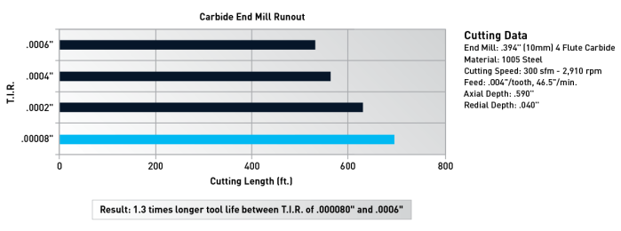 Even small amounts of runout can dramatically shorten end mill life and lead to unnecessary carbide consumption.