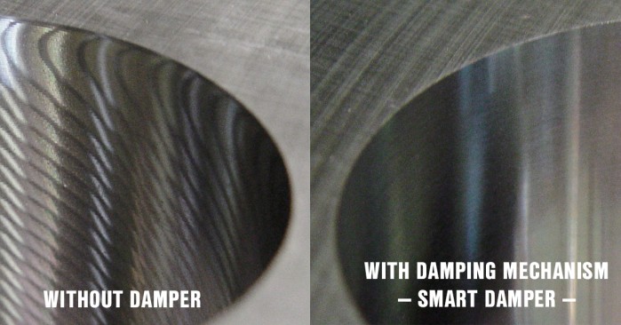 With Smart Damper, a heavyweight, strengthened damping mechanism is integrated into the tool holder and functions as both a dynamic counter and friction damper. It instantaneously absorbs vibration and eliminates chatter helping to achieve higher machining accuracy, better surface finishes and increased metal removal rates for higher productivity at critical machining depths. It’s also designed with the capability of supplying coolant through the body directly to the cutting edge.
