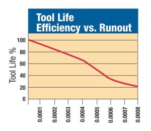 What’s more, tools that do not run concentric to their centerline are susceptible to worse wear and tear on one side of the tool. Reducing runout can therefore significantly increase tool life, yielding major long-term cost savings. Improving runout from 0.0006 inch to 0.00008 inch, for example, can triple tool life for solid carbide tools.