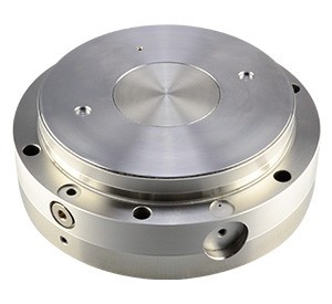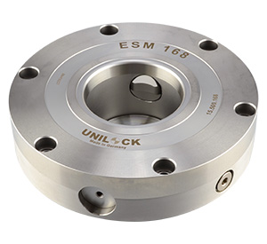 The ESM 168 round chuck is a 168 mm round chuck that can be used on the face of 4th and 5th-axis rotary tables, lathes, or mills where the center of rotation provides a through-hole to bury the workpiece.