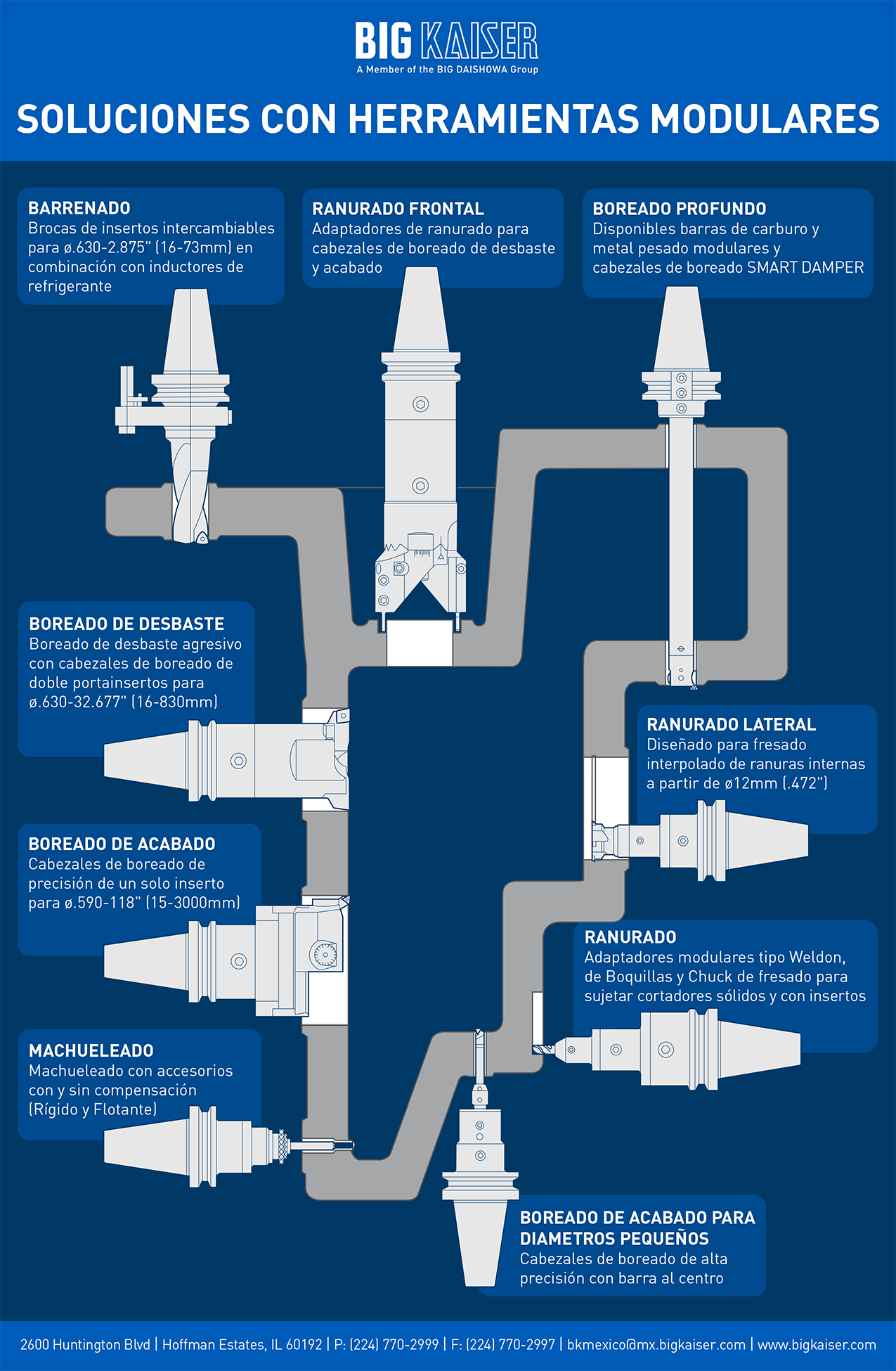 El sistema modular de KAISER es totalmente compatible con todas las interfaces de husillo de máquina herramienta y permite la posibilidad de crear ensambles de herramientas diseñados específicamente para satisfacer sus demandas en barrenado, boreado de desbaste, boreado de acabado, fresado y machueleado para crear la configuración idónea para casi cualquier aplicación.
