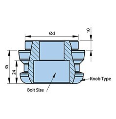 Las perillas de sujeción estándar tienen una protuberancia de posicionamiento métrica que es Ø 25 mm y rectificada a un ajuste de h6. Mide 5 mm de alto. Las medidas generales de la perilla de sujeción son Ø 40 por 40 mm de alto.
